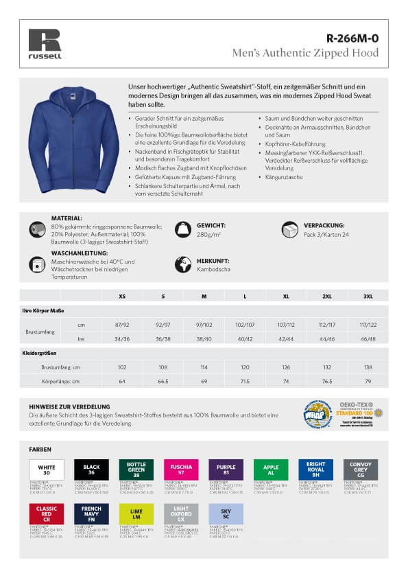 Material: 280g/m², 80% gekämmte ringgesponnene Baumwolle, 20% Polyester